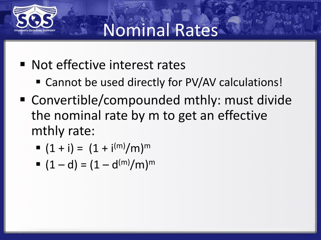 Nominal Rates • Not effective interest rates • Cannot be used directly for PV/AV calculations! • Convertible/compounded mthly: must divide the nominal rate by m to get an effective mthly rate: • (1 + i) = (1 + i(m)/m)m • (1 – d) = (1 – d(m)/m)m