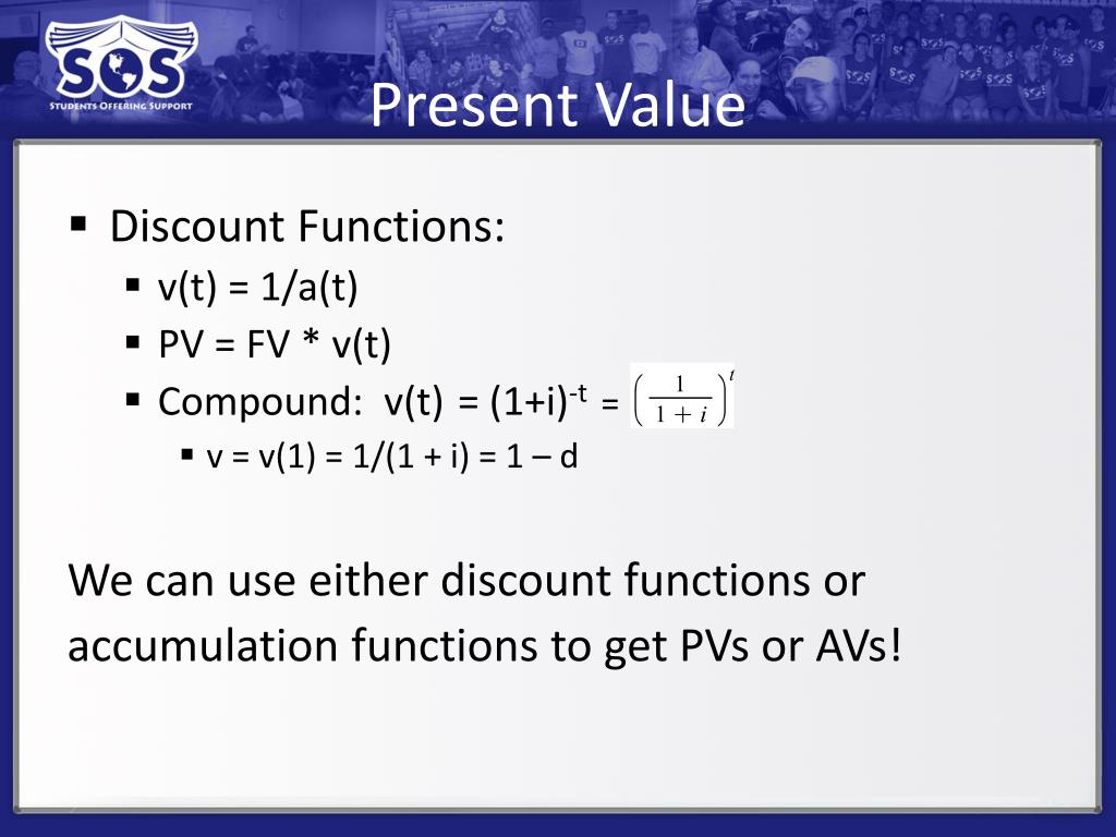 Present Value • Discount Functions: • v(t) = 1/a(t) • PV = FV * v(t) • Compound: v(t)= (1+i)-t = • v = v(1) = 1/(1 + i) = 1 – d We can use either discount functions or accumulation functions to get PVs or AVs!