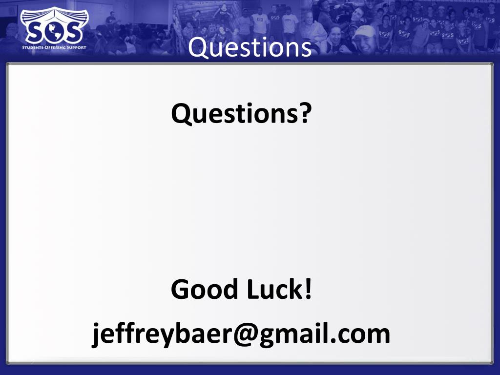 Questions Questions? Good Luck! jeffreybaer@gmail.com