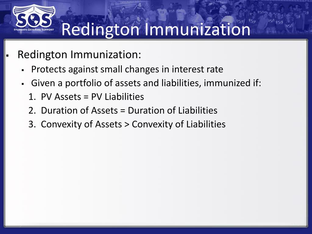 Redington Immunization • Redington Immunization: • Protects against small changes in interest rate • Given a portfolio of assets and liabilities, immunized if: 1. PV Assets = PV Liabilities 2. Duration of Assets = Duration of Liabilities 3. Convexity of Assets > Convexity of Liabilities