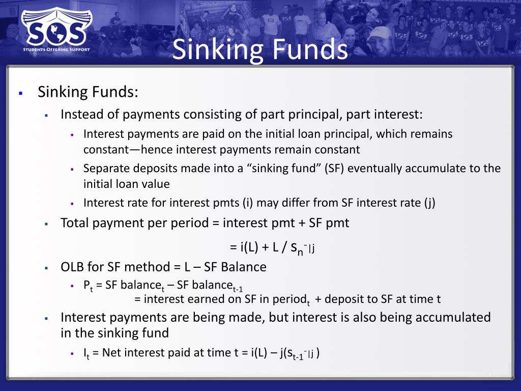 Sinking Funds • Sinking Funds: • Instead of payments consisting of part principal, part interest: • Interest payments are paid on the initial loan principal, which remains constant—hence interest payments remain constant • Separate deposits made into a “sinking fund” (SF) eventually accumulate to the initial loan value • Interest rate for interest pmts (i) may differ from SF interest rate (j) • Total payment per period = interest pmt + SF pmt = i(L) + L / sn¯|j • OLB for SF method = L – SF Balance • Pt = SF balancet – SF balancet-1 = interest earned on SF in periodt+ deposit to SF at time t • Interest payments are being made, but interest is also being accumulated in the sinking fund • It = Net interest paid at time t = i(L) – j(st-1¯|j )