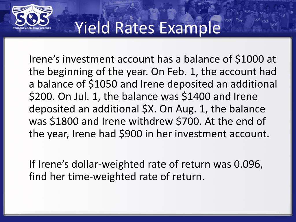 Yield Rates Example Irene’s investment account has a balance of $1000 at the beginning of the year. On Feb. 1, the account had a balance of $1050 and Irene deposited an additional $200. On Jul. 1, the balance was $1400 and Irene deposited an additional $X. On Aug. 1, the balance was $1800 and Irene withdrew $700. At the end of the year, Irene had $900 in her investment account. If Irene’s dollar-weighted rate of return was 0.096, find her time-weighted rate of return.