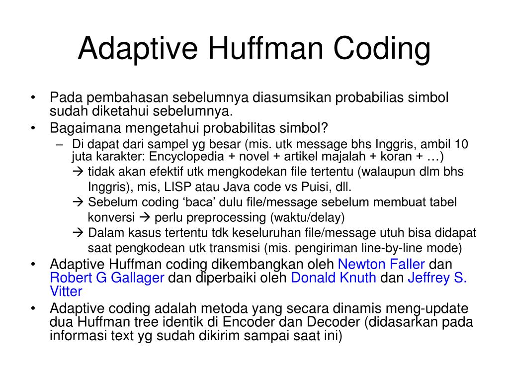 Adaptive Huffman Coding • Pada pembahasan sebelumnya diasumsikan probabilias simbol sudah diketahui sebelumnya. • Bagaimana mengetahui probabilitas simbol? • Di dapat dari sampel yg besar (mis. utk message bhs Inggris, ambil 10 juta karakter: Encyclopedia + novel + artikel majalah + koran + …) tidak akan efektif utk mengkodekan file tertentu (walaupun dlm bhs Inggris), mis, LISP atau Java code vs Puisi, dll. Sebelum coding ‘baca’ dulu file/message sebelum membuat tabel konversi perlu preprocessing (waktu/delay) Dalam kasus tertentu tdk keseluruhan file/message utuh bisa didapat saat pengkodean utk transmisi (mis. pengiriman line-by-line mode) • Adaptive Huffman coding dikembangkan oleh Newton Faller dan Robert G Gallager dan diperbaiki oleh Donald Knuth dan Jeffrey S. Vitter • Adaptive coding adalah metoda yang secara dinamis meng-update dua Huffman tree identik di Encoder dan Decoder (didasarkan pada informasi text yg sudah dikirim sampai saat ini)