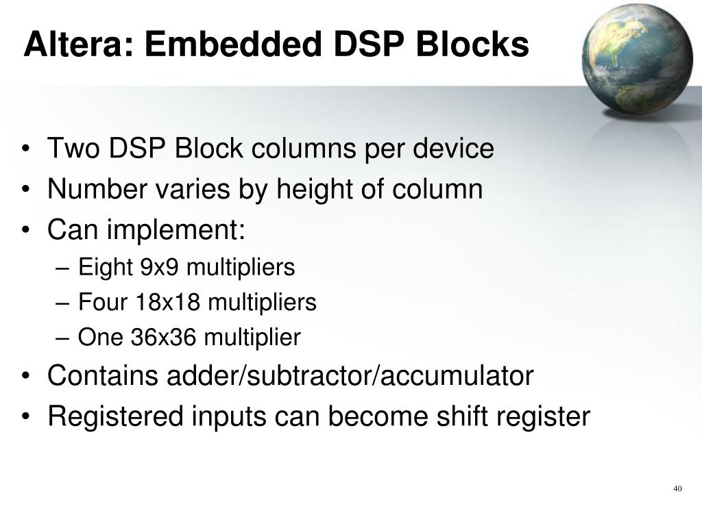 Altera: Embedded DSP Blocks • Two DSP Block columns per device • Number varies by height of column • Can implement: • Eight 9x9 multipliers • Four 18x18 multipliers • One 36x36 multiplier • Contains adder/subtractor/accumulator • Registered inputs can become shift register