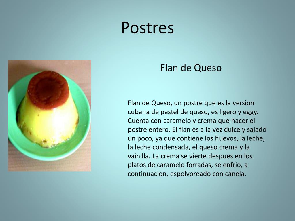 Postres Flan de Queso Flan de Queso, un postrequees la version cubana de pastel de queso, esligeroyeggy. Cuenta con carameloycremaquehacer el postreentero. El flan es a la vezdulceysalado un poco, yaquecontiene los huevos, la leche, la lechecondensada, el quesocremay la vainilla. La crema se viertedespues en los platos de carameloforradas, se enfrio, a continuacion, espolvoreado con canela.