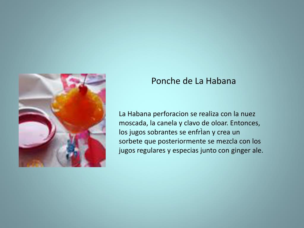 Ponche de La Habana La Habana perforacion se realiza con la nuez moscada, la canela y clavo de oloar. Entonces, los jugos sobrantes se enfrÌan y crea un sorbete que posteriormente se mezcla con los jugos regulares y especias junto con ginger ale.