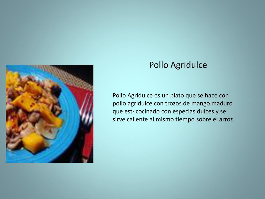 PolloAgridulce PolloAgridulcees un platoque se hace con polloagridulce con trozos de mango maduroqueest· cocinado con especiasdulcesy se sirvecaliente al mismotiemposobre el arroz.