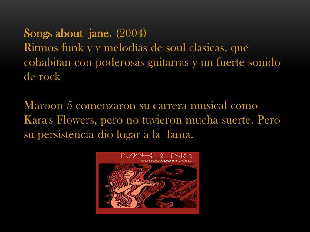 Songs about jane. (2004)Ritmos funk y y melodías de soul clásicas, que cohabitan con poderosas guitarras y un fuerte sonido de rockMaroon 5 comenzaron su carrera musical como Kara's Flowers, pero no tuvieron mucha suerte. Pero su persistencia dio lugar a la fama. m