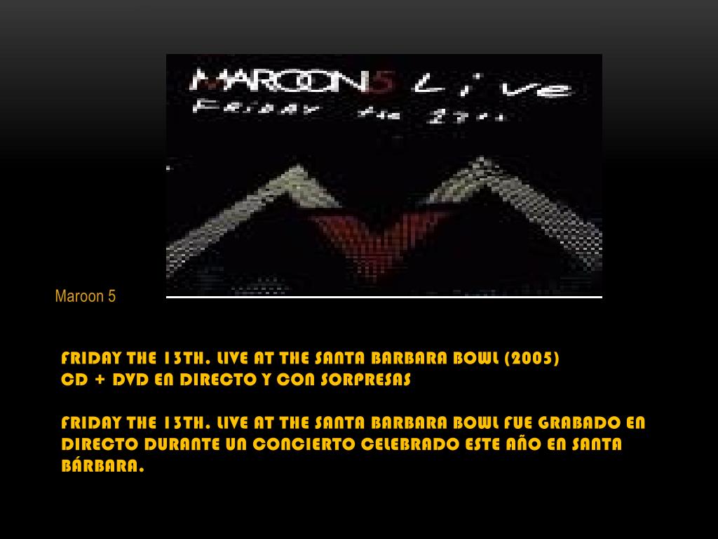 Maroon 5 Friday the 13th. Live at The Santa Barbara Bowl (2005)CD + DVD en directo y con sorpresasFriday the 13th. Live at The Santa Barbara Bowl fue grabado en directo durante un concierto celebrado este año en Santa Bárbara.
