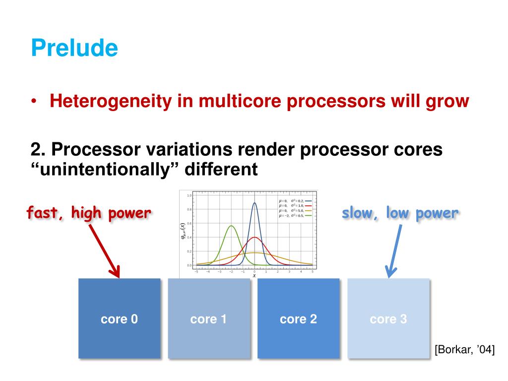 Prelude slow, low power fast, high power core 0 core 1 core 2 core 3 [Borkar, ’04] Heterogeneity in multicore processors will grow 2. Processor variations render processor cores “unintentionally” different