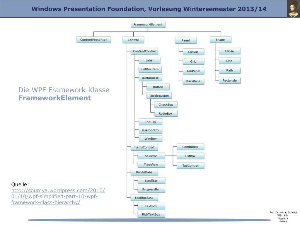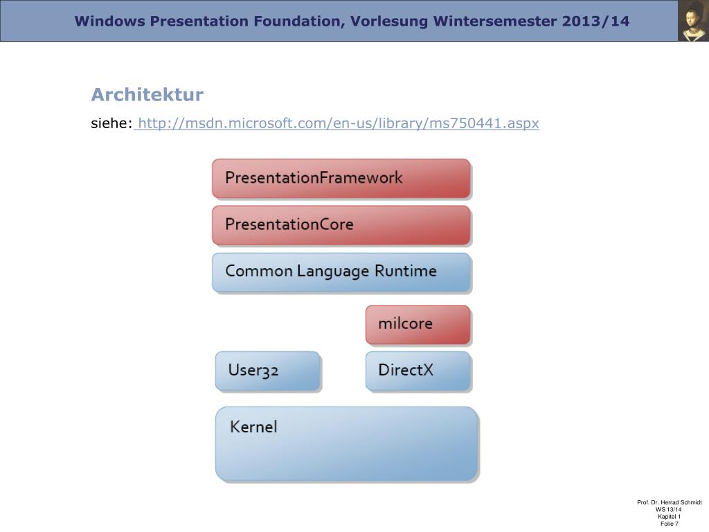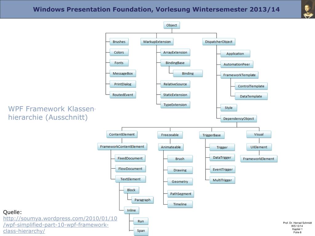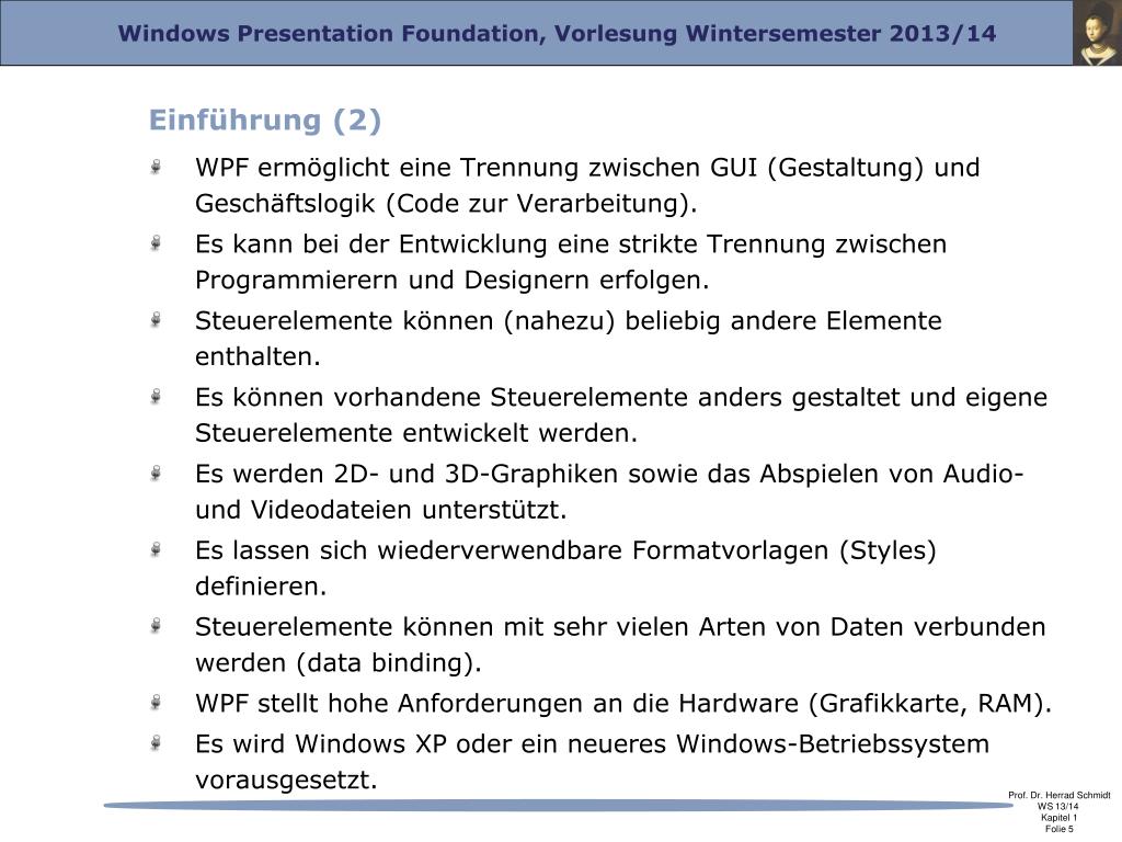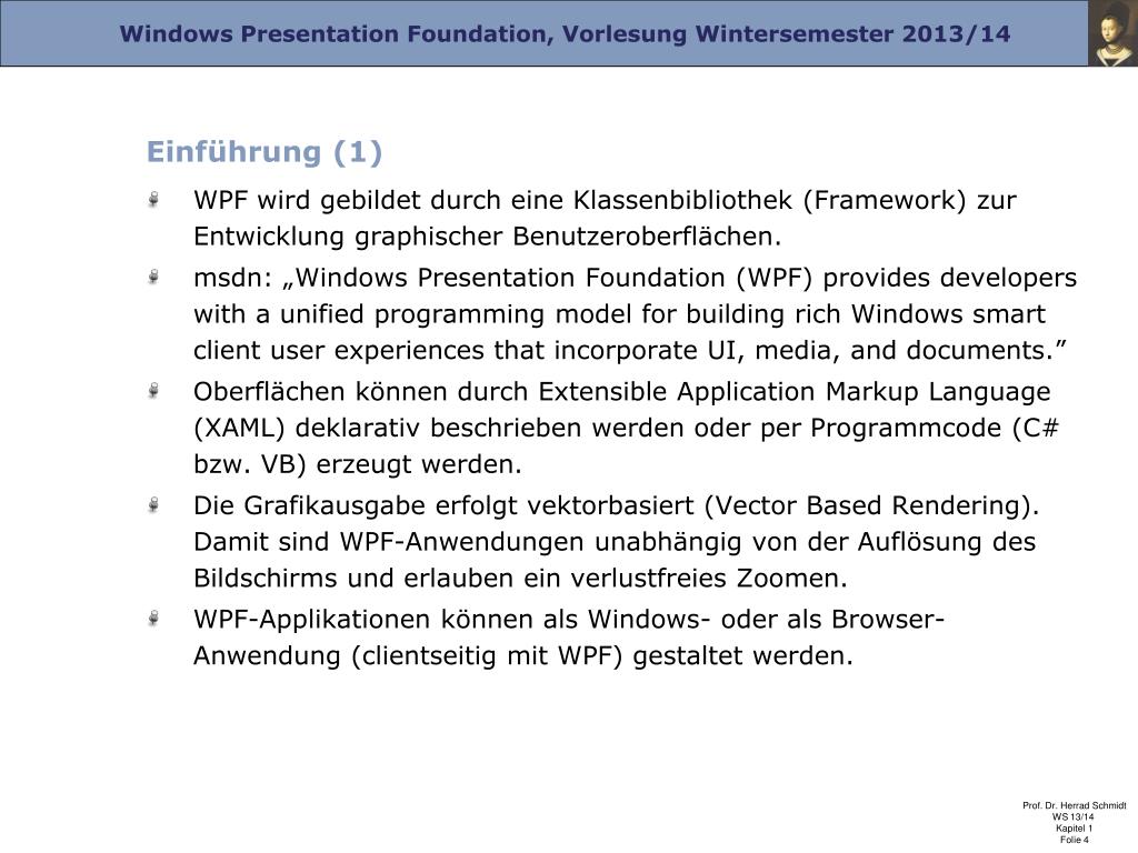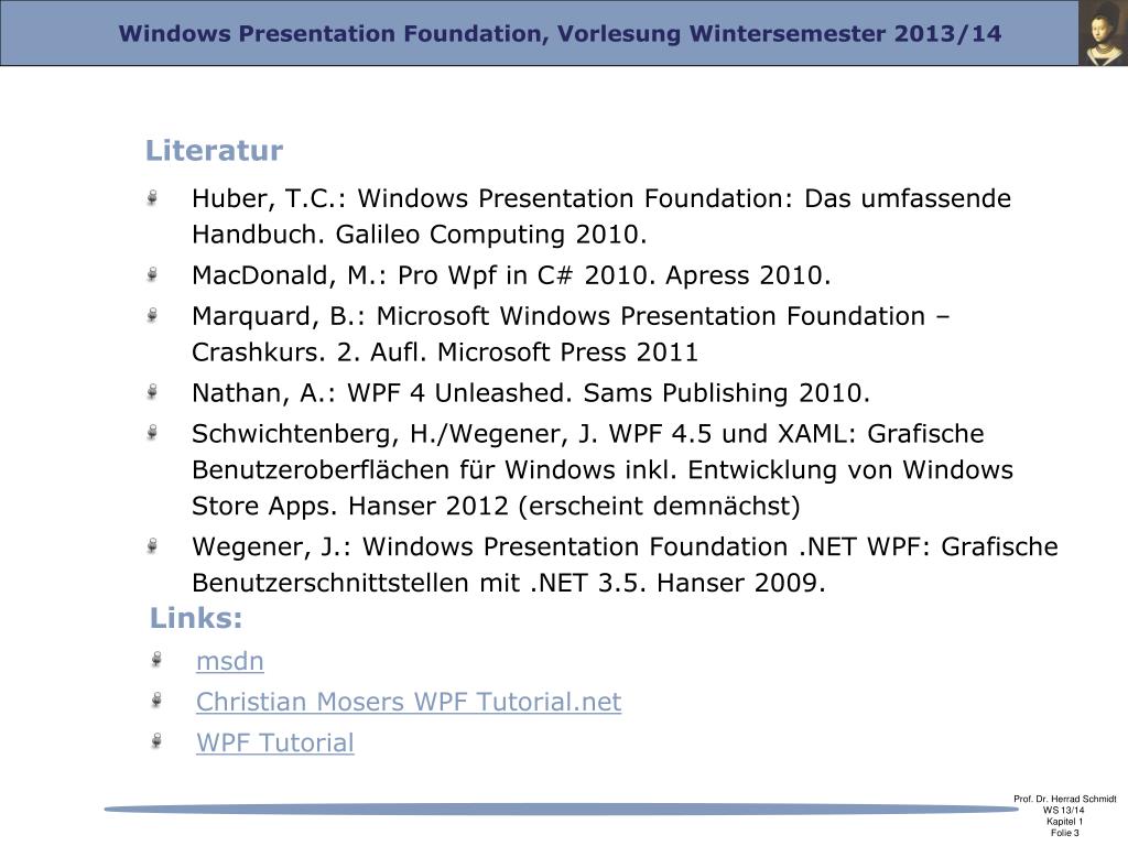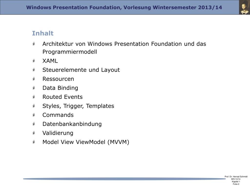 Windows Presentation Foundation WS 2013/14 Prof. Dr. Herrad Schmidt. Kapitel 1 Gliederung Literatur Einführung. Inhalt Architektur von Windows Presentation Foundation und das Programmiermodell XAML Steuerelemente und Layout Ressourcen Data Binding Routed Events