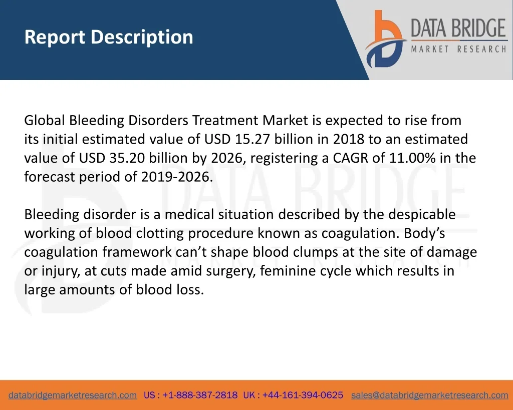 Report Description Global Bleeding Disorders Treatment Market is expected to rise from its initial estimated value of USD 15.27 billion in 2018 to an estimated value of USD 35.20 billion by 2026, registering a CAGR of 11.00% in the forecast period of 2019-2026. Bleeding disorder is a medical situation described by the despicable working of blood clotting procedure known as coagulation. Body’s coagulation framework can’t shape blood clumps at the site of damage or injury, at cuts made amid surgery, feminine cycle which results in large amounts of blood loss.