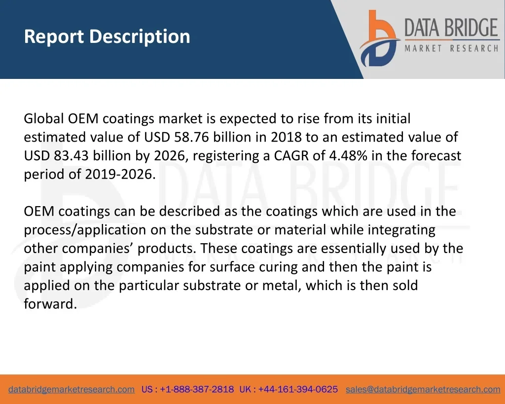 Report Description Global OEM coatings market is expected to rise from its initial estimated value of USD 58.76 billion in 2018 to an estimated value of USD 83.43 billion by 2026, registering a CAGR of 4.48% in the forecast period of 2019-2026. OEM coatings can be described as the coatings which are used in the process/application on the substrate or material while integrating other companies’ products. These coatings are essentially used by the paint applying companies for surface curing and then the paint is applied on the particular substrate or metal, which is then sold forward.