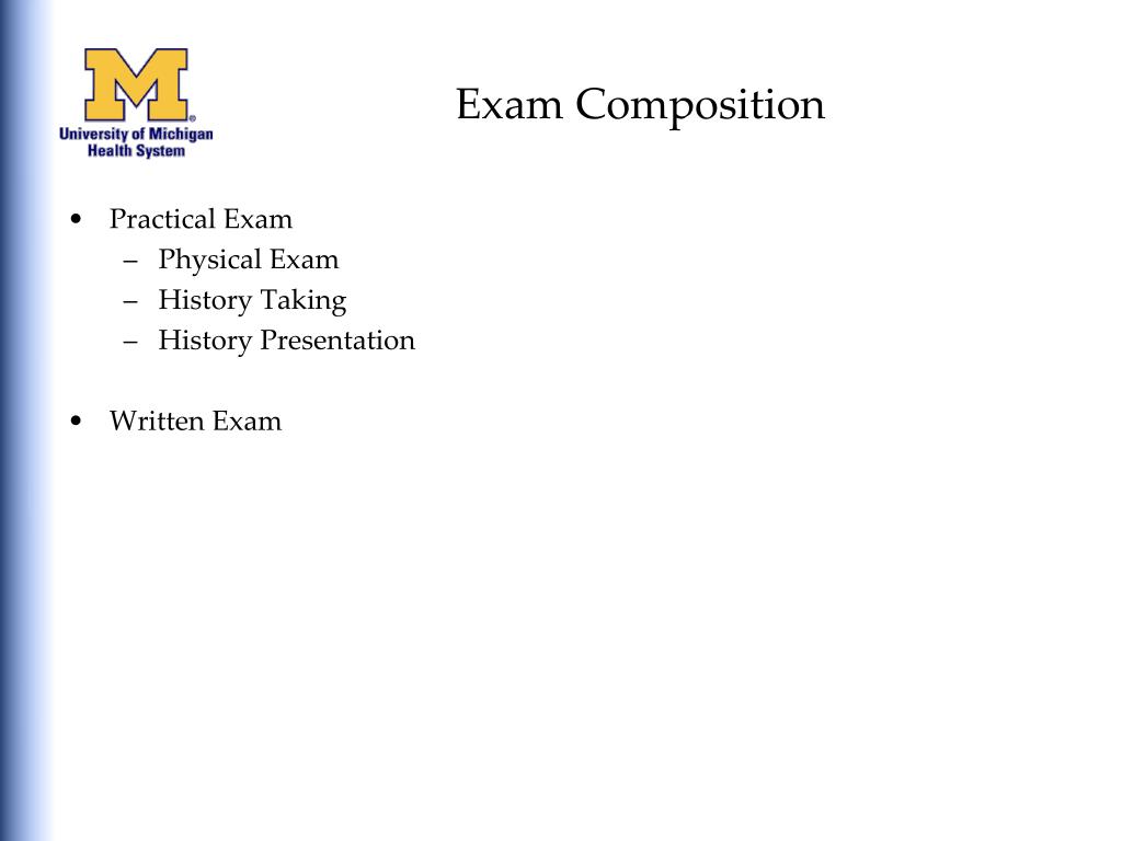 Exam Composition • Practical Exam • Physical Exam • History Taking • History Presentation • Written Exam