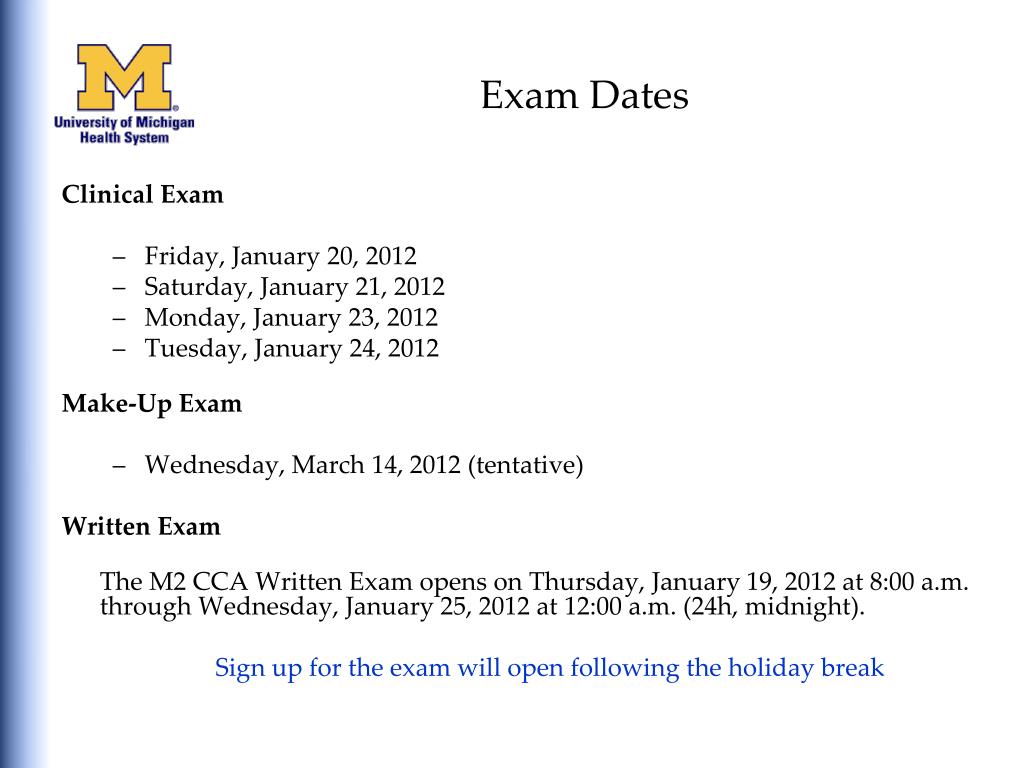 Exam Dates Clinical Exam • Friday, January 20, 2012 • Saturday, January 21, 2012 • Monday, January 23, 2012 • Tuesday, January 24, 2012 Make-Up Exam • Wednesday, March 14, 2012 (tentative) Written Exam The M2 CCA Written Exam opens on Thursday, January 19, 2012 at 8:00 a.m. through Wednesday, January 25, 2012 at 12:00 a.m. (24h, midnight). Sign up for the exam will open following the holiday break