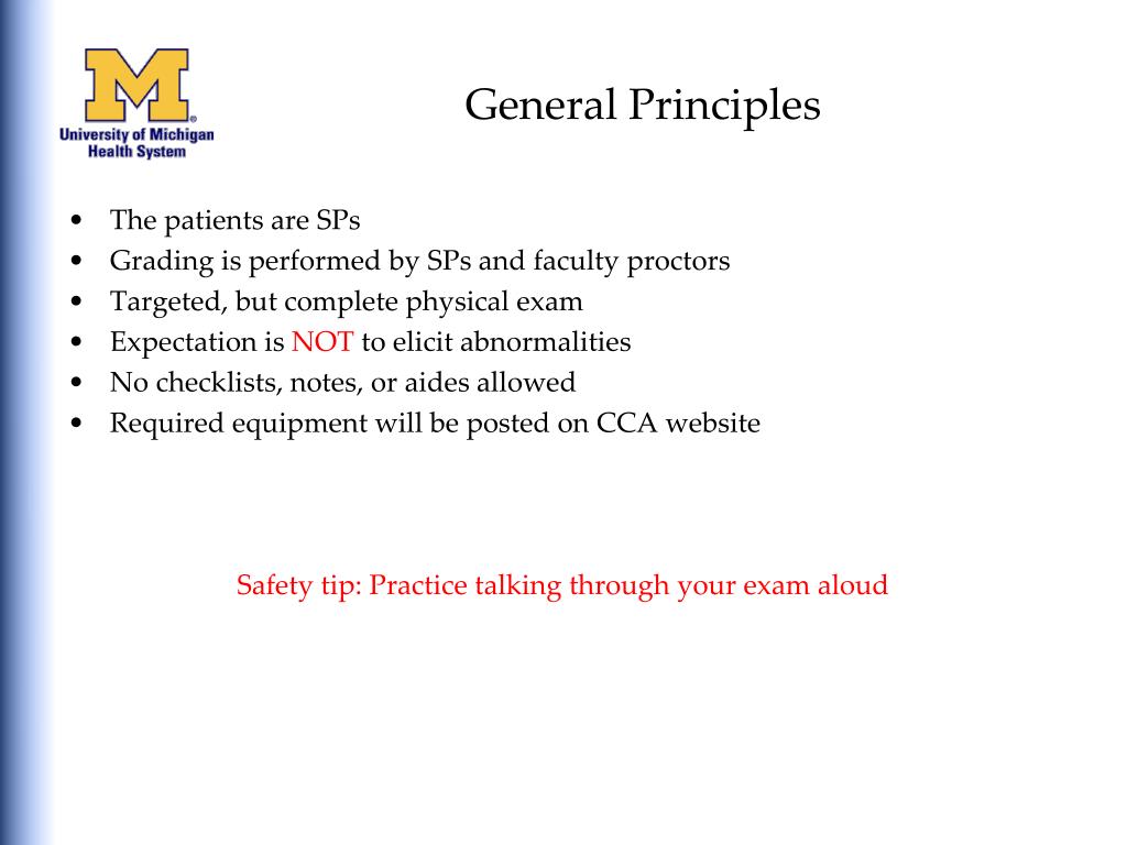 General Principles • The patients are SPs • Grading is performed by SPs and faculty proctors • Targeted, but complete physical exam • Expectation is NOT to elicit abnormalities • No checklists, notes, or aides allowed • Required equipment will be posted on CCA website Safety tip: Practice talking through your exam aloud