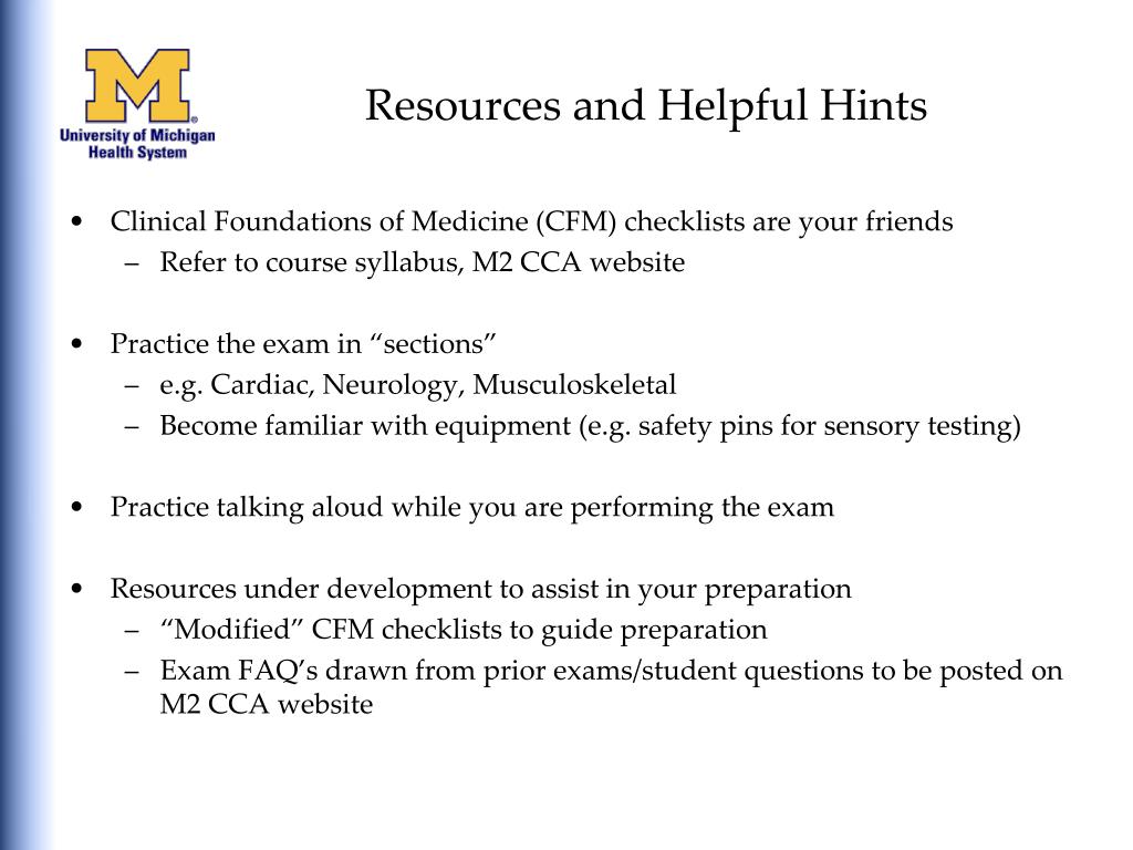 Preparation and Resources • Review content specifications (M2 CCA website) • CFM written exam • Review physical exam outlines • Review physical exam checklists • Swartz: Textbook of Physical Diagnosis