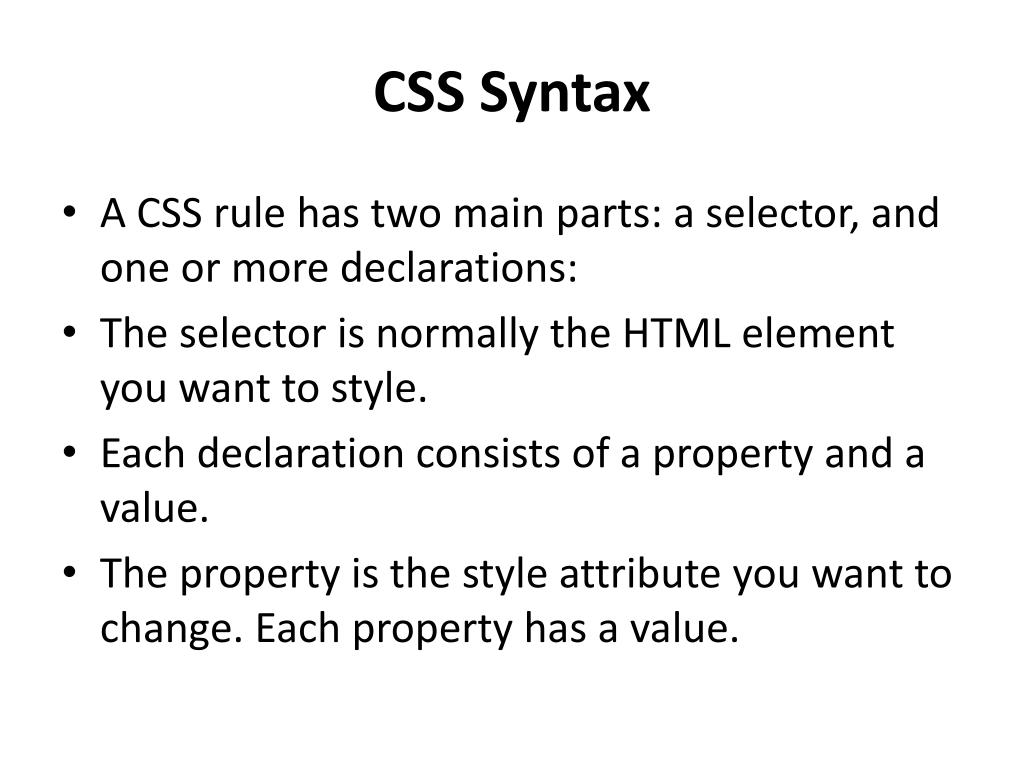 CSS Syntax • A CSS rule has two main parts: a selector, and one or more declarations: • The selector is normally the HTML element you want to style. • Each declaration consists of a property and a value. • The property is the style attribute you want to change. Each property has a value.