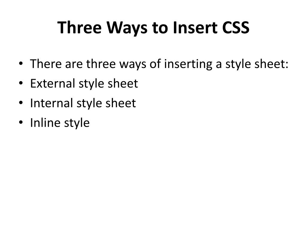 Three Ways to Insert CSS • There are three ways of inserting a style sheet: • External style sheet • Internal style sheet • Inline style