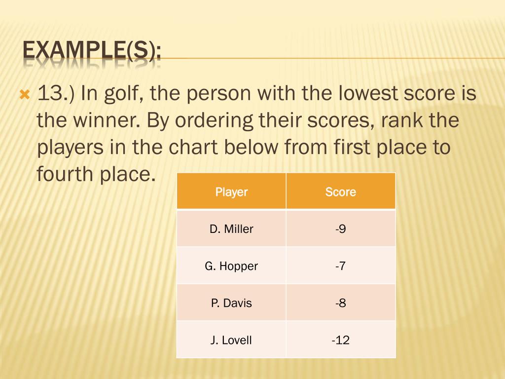 13.) In golf, the person with the lowest score is the winner. By ordering their scores, rank the players in the chart below from first place to fourth place. Example(s):