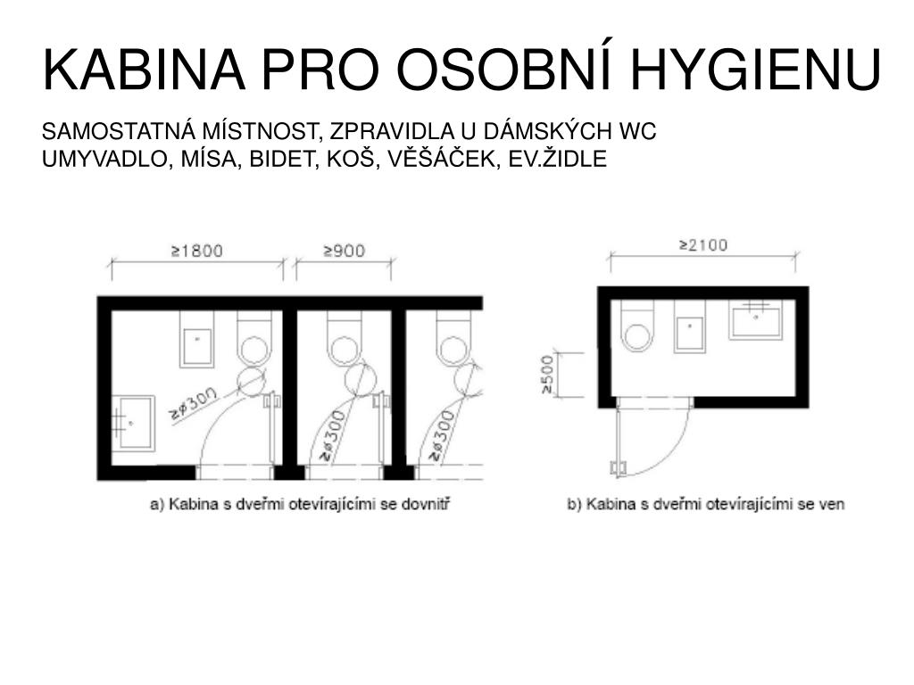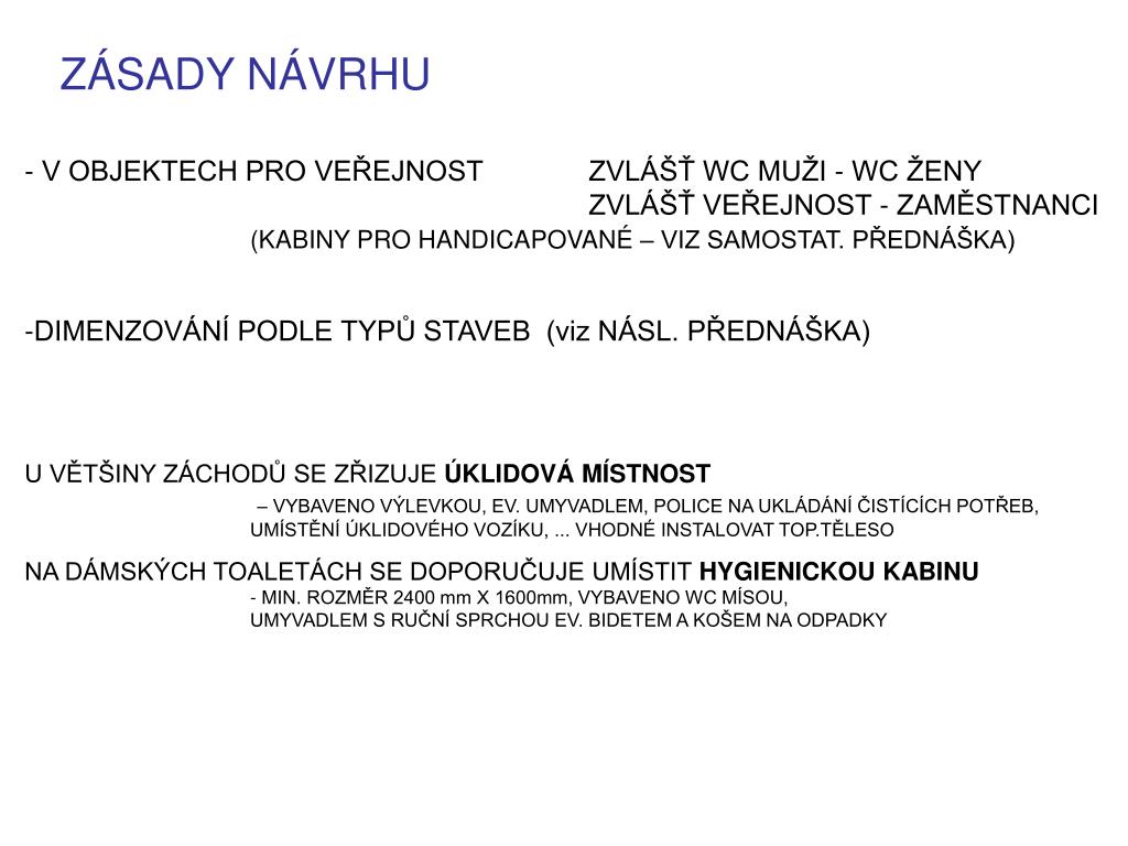 ZÁSADY NÁVRHU - V OBJEKTECH PRO VEŘEJNOST ZVLÁŠŤ WC MUŽI - WC ŽENY ZVLÁŠŤ VEŘEJNOST - ZAMĚSTNANCI (KABINY PRO HANDICAPOVANÉ – VIZ SAMOSTAT. PŘEDNÁŠKA) • DIMENZOVÁNÍ PODLE TYPŮ STAVEB (viz NÁSL. PŘEDNÁŠKA) • U VĚTŠINY ZÁCHODŮ SE ZŘIZUJE ÚKLIDOVÁ MÍSTNOST– VYBAVENO VÝLEVKOU, EV. UMYVADLEM, POLICE NA UKLÁDÁNÍ ČISTÍCÍCH POTŘEB, UMÍSTĚNÍ ÚKLIDOVÉHO VOZÍKU, ... VHODNÉ INSTALOVAT TOP.TĚLESO • NA DÁMSKÝCH TOALETÁCH SE DOPORUČUJE UMÍSTIT HYGIENICKOU KABINU - MIN. ROZMĚR 2400 mm X 1600mm, VYBAVENO WC MÍSOU, UMYVADLEM S RUČNÍ SPRCHOU EV. BIDETEM A KOŠEM NA ODPADKY