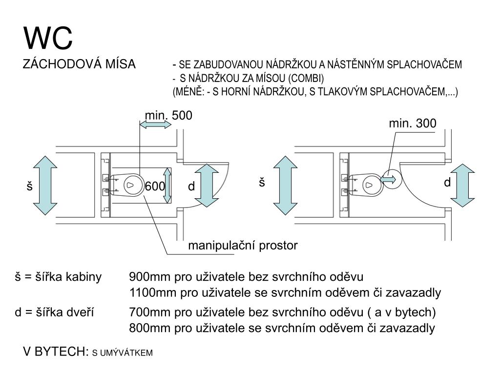 WC ZÁCHODOVÁ MÍSA - SE ZABUDOVANOU NÁDRŽKOU A NÁSTĚNNÝM SPLACHOVAČEM- S NÁDRŽKOU ZA MÍSOU (COMBI) (MÉNĚ: - S HORNÍ NÁDRŽKOU, S TLAKOVÝM SPLACHOVAČEM,...) min. 500 min. 300 d š š 600 d manipulační prostor š = šířka kabiny 900mm pro uživatele bez svrchního oděvu 1100mm pro uživatele se svrchním oděvem či zavazadly d = šířka dveří 700mm pro uživatele bez svrchního oděvu ( a v bytech) 800mm pro uživatele se svrchním oděvem či zavazadly V BYTECH: S UMÝVÁTKEM