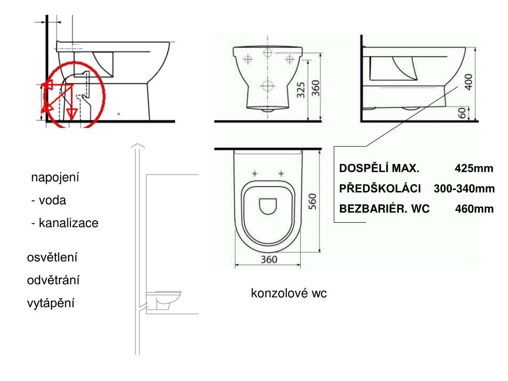 DOSPĚLÍ MAX. 425mm PŘEDŠKOLÁCI 300-340mm BEZBARIÉR. WC 460mm • napojení • voda • kanalizace osvětlení odvětrání vytápění konzolové wc