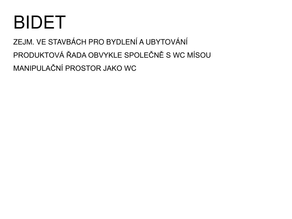 BIDET ZEJM. VE STAVBÁCH PRO BYDLENÍ A UBYTOVÁNÍ PRODUKTOVÁ ŘADA OBVYKLE SPOLEČNĚ S WC MÍSOU MANIPULAČNÍ PROSTOR JAKO WC
