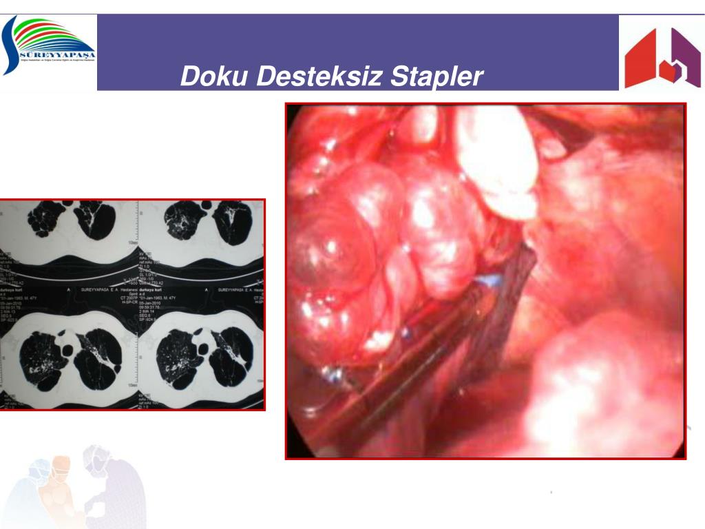 3)Stapler Hattının Desteklenmesi- II • Otolog • Bül’ün duvarı • Perikard • Perikardial yağ dokusu * • Pariyetel plevra (Bül duvarı) (Pariyetel plevra) * Matsumoto I, Ohta Y, Oda M, et al. Free pericardial fat pads can act as sealant for preventing alveolar air leaks. Ann Thorac Surg 2005;80(6):2321-4.