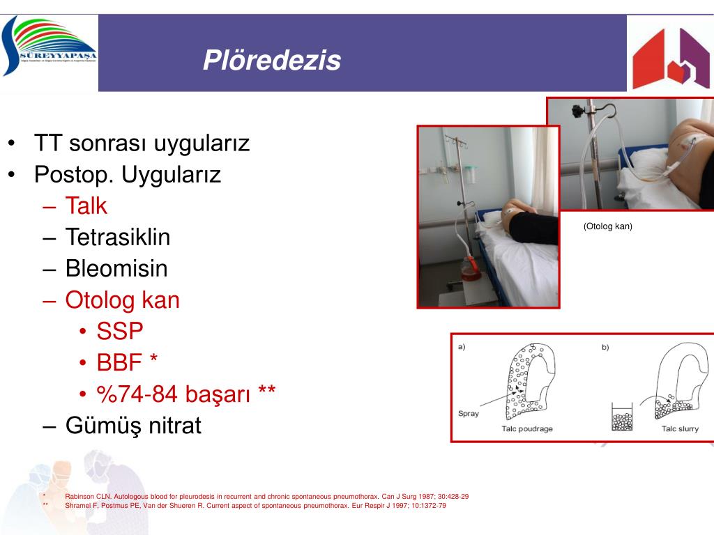 Plöredezis • TT sonrası uygularız • Postop. Uygularız • Talk • Tetrasiklin • Bleomisin • Otolog kan • SSP • BBF * • %74-84 başarı ** • Gümüş nitrat * Rabinson CLN. Autologous blood for pleurodesis in recurrent and chronic spontaneous pneumothorax. Can J Surg 1987; 30:428-29 ** Shramel F, Postmus PE, Van der Shueren R. Current aspect of spontaneous pneumothorax. Eur Respir J 1997; 10:1372-79 (Otolog kan)