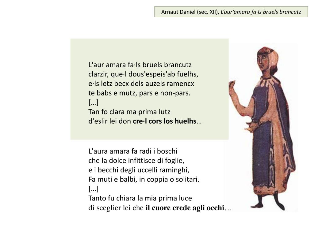 Arnaut Daniel (sec. XII), L’aur’amara fa·ls bruels brancutz L'aur amara fa·ls bruels brancutz clarzir, que·l dous'espeis'ab fuelhs, e·ls letz becx dels auzels ramencx te babs e mutz, pars e non-pars. […] Tan fo clara ma prima lutz d'eslir lei don cre·l cors los huelhs… L'aura amara fa radi i boschi che la dolce infittisce di foglie, e i becchi degli uccelli raminghi, Fa muti e balbi, in coppia o solitari. […] Tanto fu chiara la mia prima luce di sceglier lei che il cuore crede agli occhi…