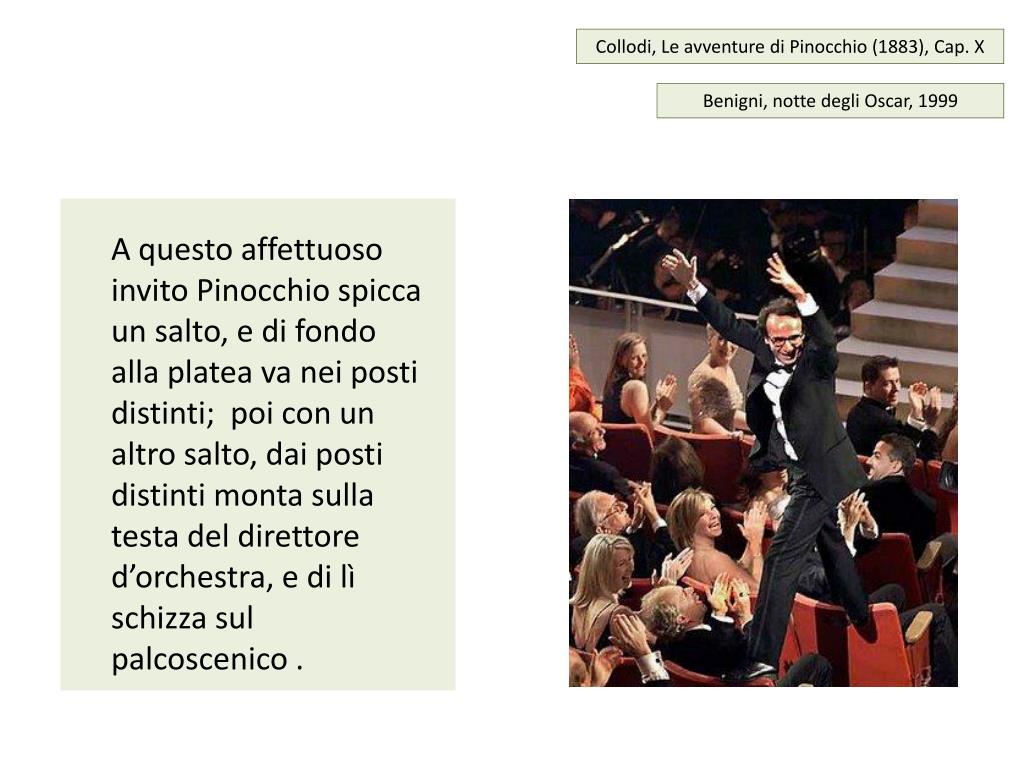 Collodi, Le avventure di Pinocchio (1883), Cap. X Benigni, notte degli Oscar, 1999 A questo affettuoso invito Pinocchio spicca un salto, e di fondo alla platea va nei posti distinti; poi con un altro salto, dai posti distinti monta sulla testa del direttore d’orchestra, e di lì schizza sul palcoscenico .