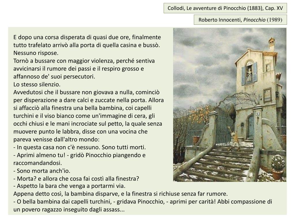 Collodi, Le avventure di Pinocchio (1883), Cap. XV Roberto Innocenti, Pinocchio (1989) • E dopo una corsa disperata di quasi due ore, finalmente tutto trafelato arrivò alla porta di quella casina e bussò. • Nessuno rispose. • Tornò a bussare con maggior violenza, perché sentiva avvicinarsi il rumore dei passi e il respiro grosso e affannoso de' suoi persecutori. • Lo stesso silenzio. • Avvedutosi che il bussare non giovava a nulla, cominciò per disperazione a dare calci e zuccate nella porta. Allora si affacciò alla finestra una bella bambina, coi capelli turchini e il viso bianco come un'immagine di cera, gli occhi chiusi e le mani incrociate sul petto, la quale senza muovere punto le labbra, disse con una vocina che pareva venisse dall'altro mondo: • - In questa casa non c'è nessuno. Sono tutti morti. • - Aprimi almeno tu! - gridò Pinocchio piangendo e raccomandandosi. • Sono morta anch'io. • Morta? e allora che cosa fai costì alla finestra? - Aspetto la bara che venga a portarmi via. Appena detto così, la bambina disparve, e la finestra si richiuse senza far rumore. - O bella bambina dai capelli turchini, - gridava Pinocchio, - aprimi per carità! Abbi compassione di un povero ragazzo inseguito dagli assass...