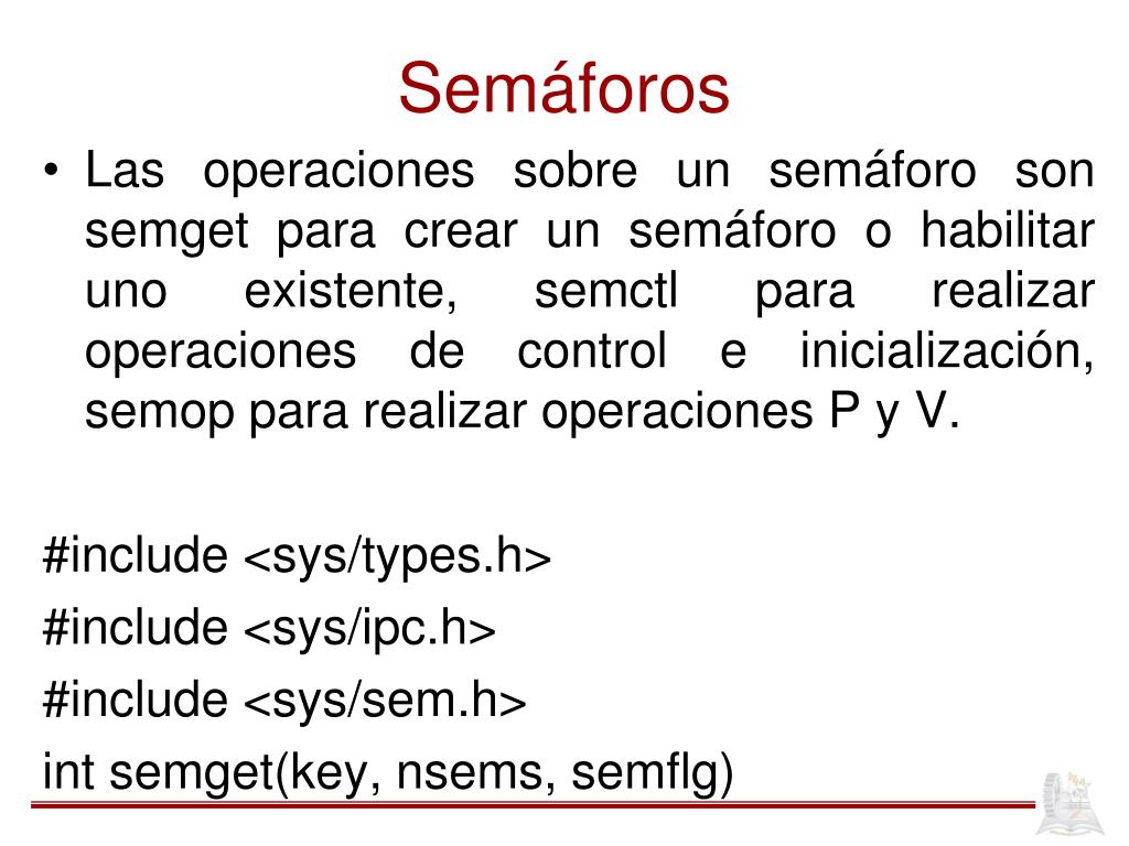 Semáforos Las operaciones sobre un semáforo son semget para crear un semáforo o habilitar uno existente, semctl para realizar operaciones de control e inicialización, semop para realizar operaciones P y V. #include <sys/types.h> #include <sys/ipc.h> #include <sys/sem.h> int semget(key, nsems, semflg)