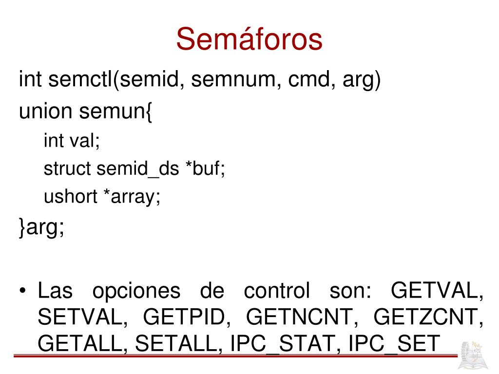 Semáforos int semctl(semid, semnum, cmd, arg) union semun{ int val; struct semid_ds *buf; ushort *array; }arg; Las opciones de control son: GETVAL, SETVAL, GETPID, GETNCNT, GETZCNT, GETALL, SETALL, IPC_STAT, IPC_SET