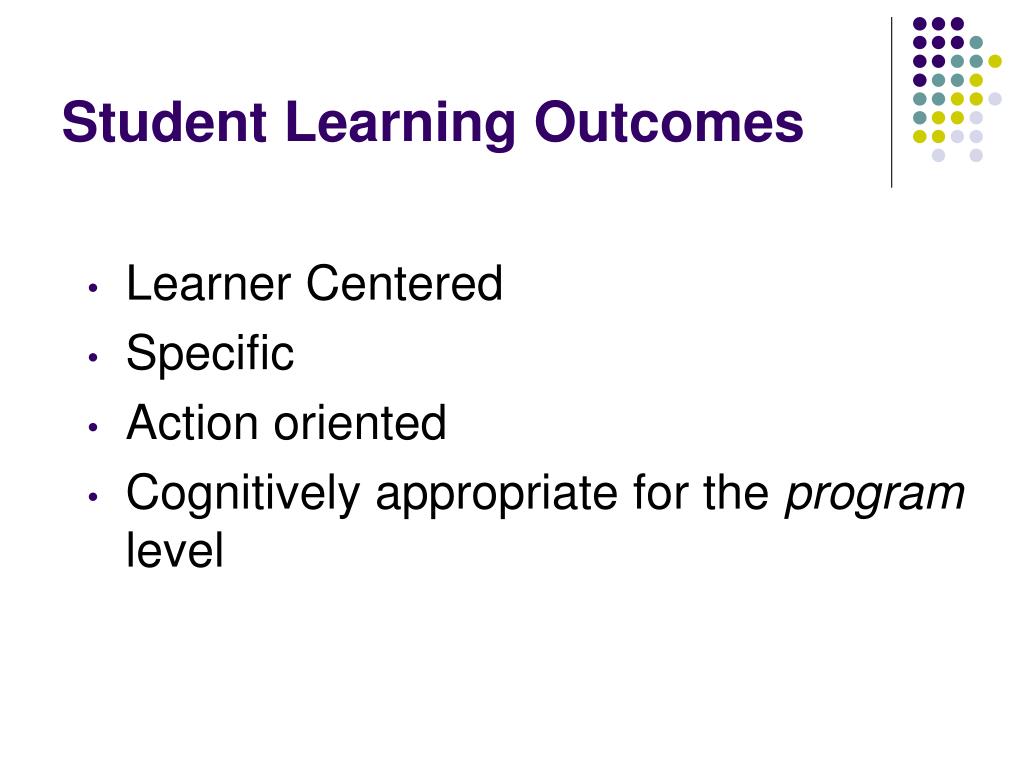 Student Learning Outcomes • Learner Centered • Specific • Action oriented • Cognitively appropriate for the program level