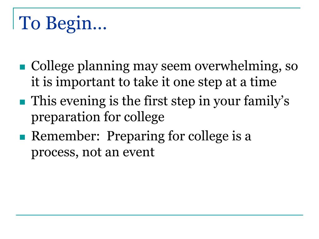 To Begin… • College planning may seem overwhelming, so it is important to take it one step at a time • This evening is the first step in your family’s preparation for college • Remember: Preparing for college is a process, not an event