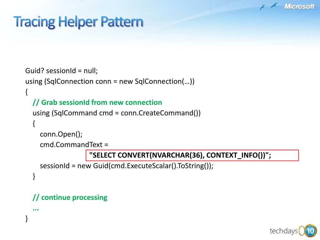 Tracing Helper Pattern • Guid? sessionId = null; • using (SqlConnection conn = new SqlConnection(…)) • { • // Grab sessionId from new connection • using (SqlCommandcmd = conn.CreateCommand()) • { • conn.Open(); • cmd.CommandText = • "SELECT CONVERT(NVARCHAR(36), CONTEXT_INFO())"; • sessionId = new Guid(cmd.ExecuteScalar().ToString()); • } • // continue processing • ... • }