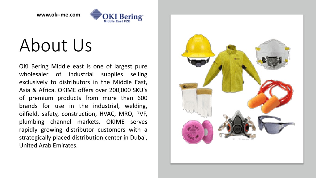 About Us www.oki-me.com OKI Bering Middle east is one of largest pure wholesaler of industrial supplies selling exclusively to distributors in the Middle East, Asia & Africa. OKIME offers over 200,000 SKU's of premium products from more than 600 brands for use in the industrial, welding, oilfield, safety, construction, HVAC, MRO, PVF, plumbing channel markets. OKIME serves rapidly growing distributor customers with a strategically placed distribution center in Dubai, United Arab Emirates.