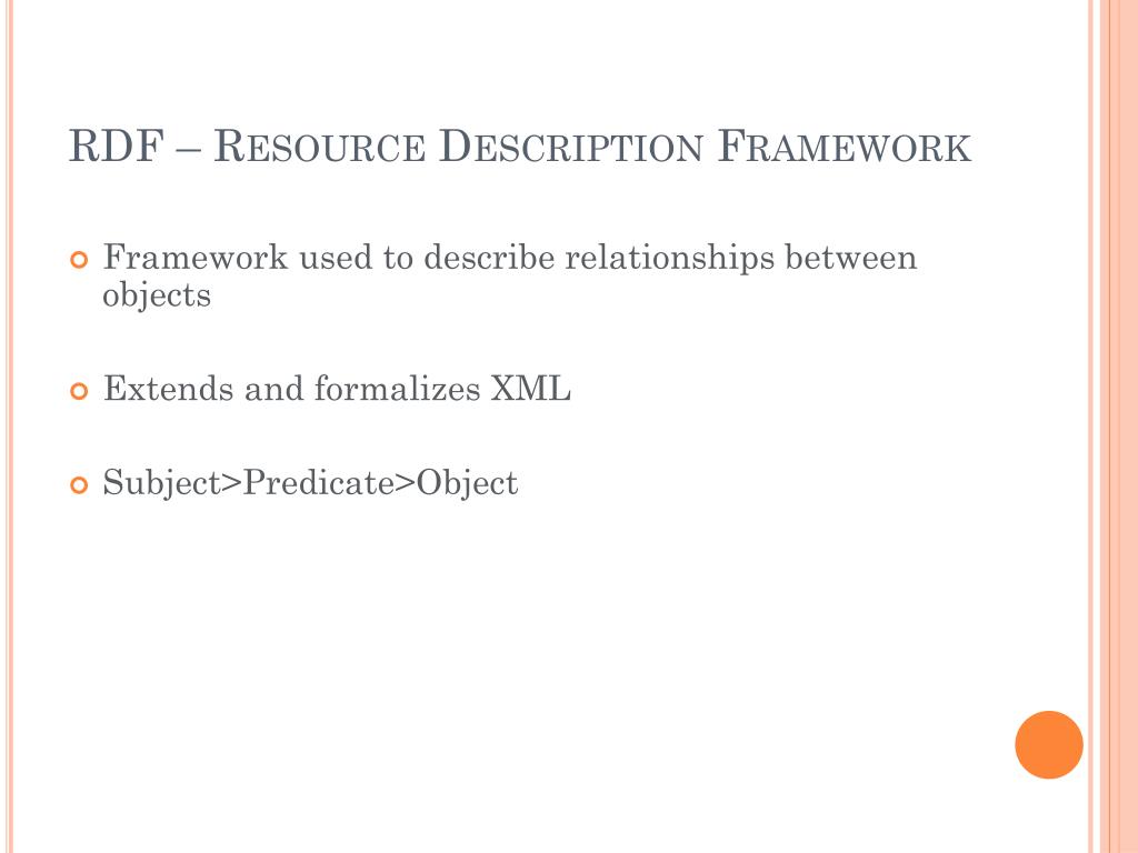 RDF – Resource Description Framework • Framework used to describe relationships between objects • Extends and formalizes XML • Subject>Predicate>Object
