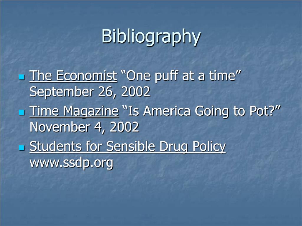 Bibliography • The Economist “One puff at a time” September 26, 2002 • Time Magazine “Is America Going to Pot?” November 4, 2002 • Students for Sensible Drug Policy www.ssdp.org
