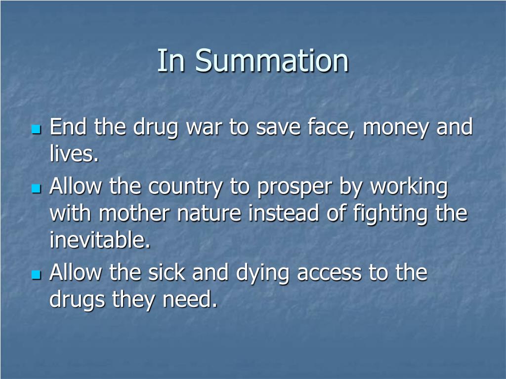 In Summation • End the drug war to save face, money and lives. • Allow the country to prosper by working with mother nature instead of fighting the inevitable. • Allow the sick and dying access to the drugs they need.