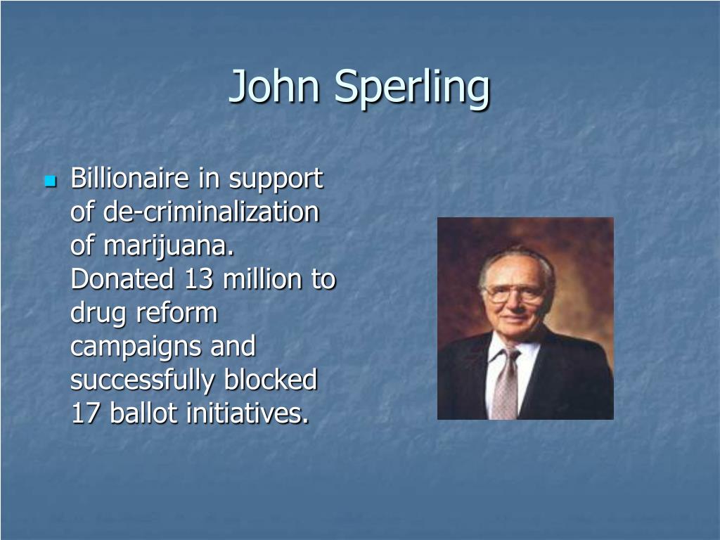 John Sperling • Billionaire in support of de-criminalization of marijuana. Donated 13 million to drug reform campaigns and successfully blocked 17 ballot initiatives.