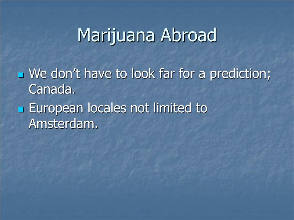 Marijuana Abroad • We don’t have to look far for a prediction; Canada. • European locales not limited to Amsterdam.