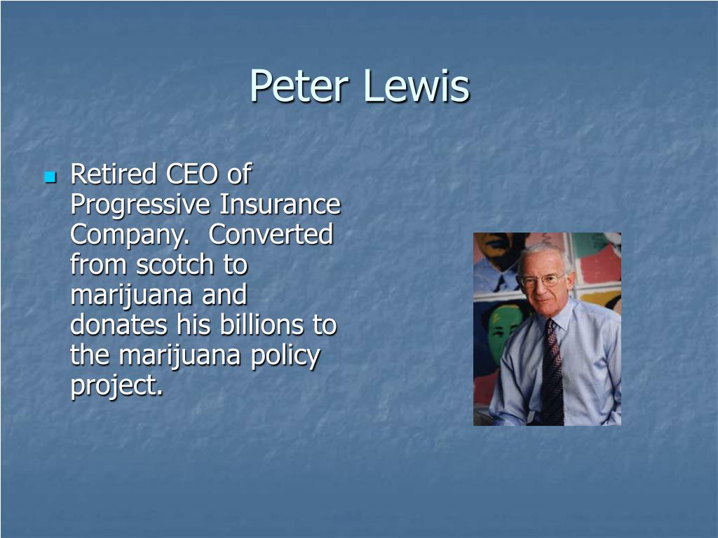 Peter Lewis • Retired CEO of Progressive Insurance Company. Converted from scotch to marijuana and donates his billions to the marijuana policy project.
