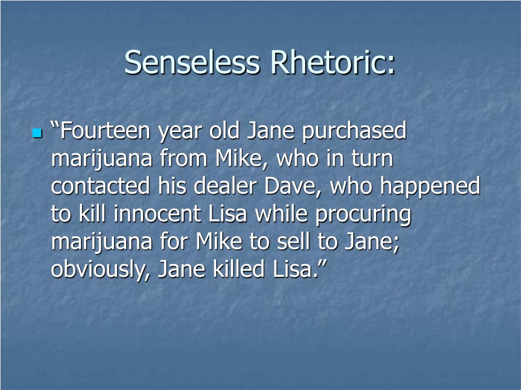 Senseless Rhetoric: • “Fourteen year old Jane purchased marijuana from Mike, who in turn contacted his dealer Dave, who happened to kill innocent Lisa while procuring marijuana for Mike to sell to Jane; obviously, Jane killed Lisa.”