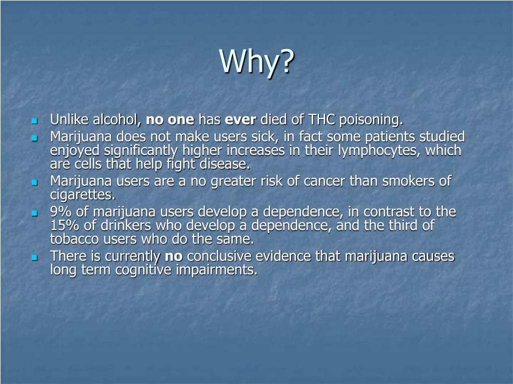 Why? • Unlike alcohol, no one has ever died of THC poisoning. • Marijuana does not make users sick, in fact some patients studied enjoyed significantly higher increases in their lymphocytes, which are cells that help fight disease. • Marijuana users are a no greater risk of cancer than smokers of cigarettes. • 9% of marijuana users develop a dependence, in contrast to the 15% of drinkers who develop a dependence, and the third of tobacco users who do the same. • There is currently no conclusive evidence that marijuana causes long term cognitive impairments.