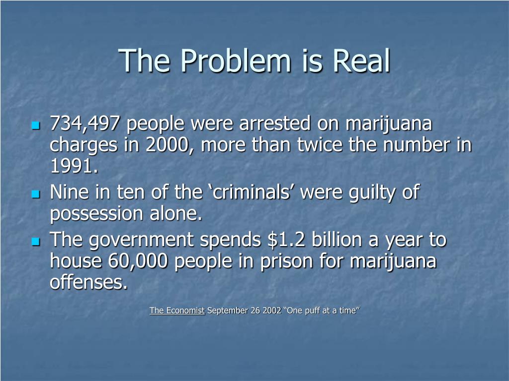 The Problem is Real • 734,497 people were arrested on marijuana charges in 2000, more than twice the number in 1991. • Nine in ten of the ‘criminals’ were guilty of possession alone. • The government spends $1.2 billion a year to house 60,000 people in prison for marijuana offenses. The Economist September 26 2002 “One puff at a time”