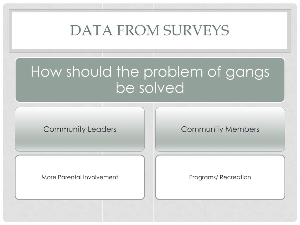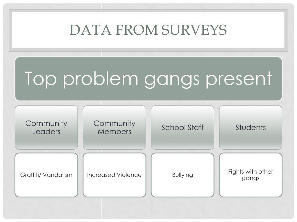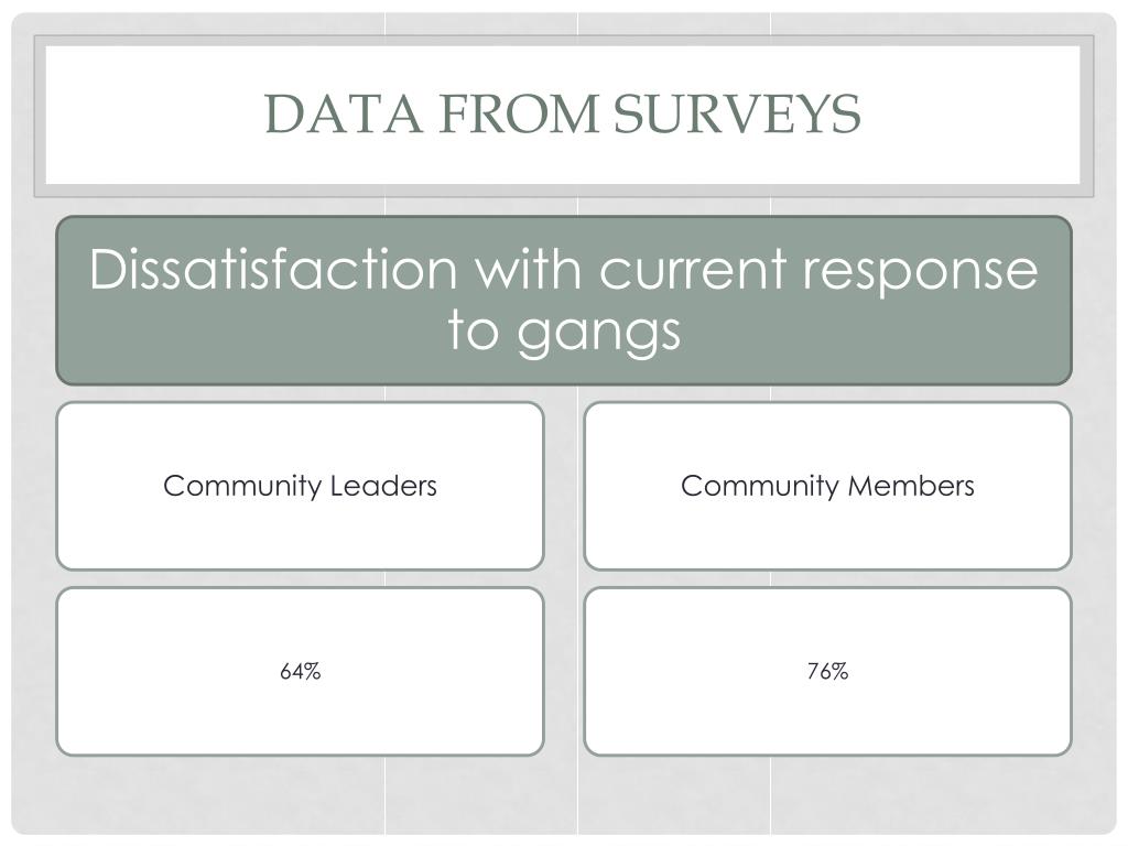Types of Data • Community Data • Community Members • Community Leaders • Youth Serving Organizations • Law Enforcement Data • Gang Members • Parents of Gang Members • School/Youth Data • Students • School Staff