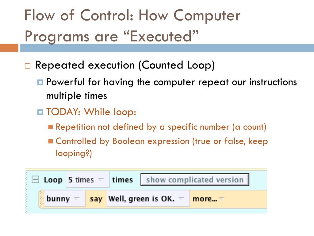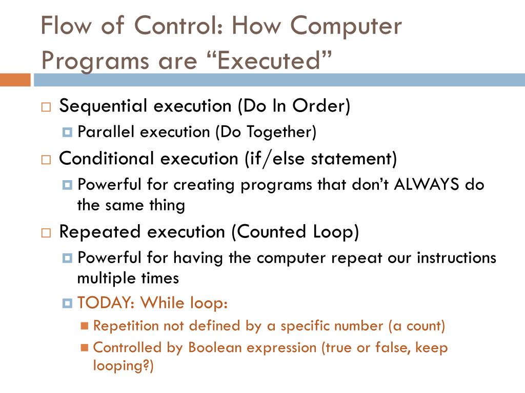 Flow of Control: How Computer Programs are “Executed” • Repeated execution (Counted Loop) • Powerful for having the computer repeat our instructions multiple times • TODAY: While loop: • Repetition not defined by a specific number (a count) • Controlled by Boolean expression (true or false, keep looping?)
